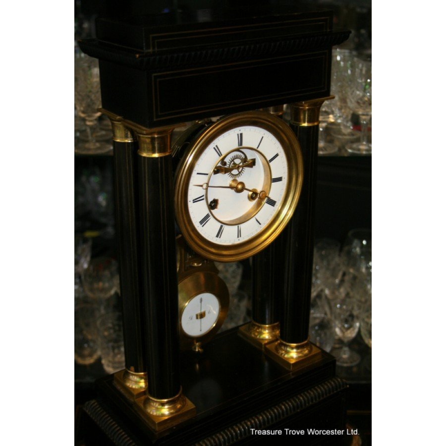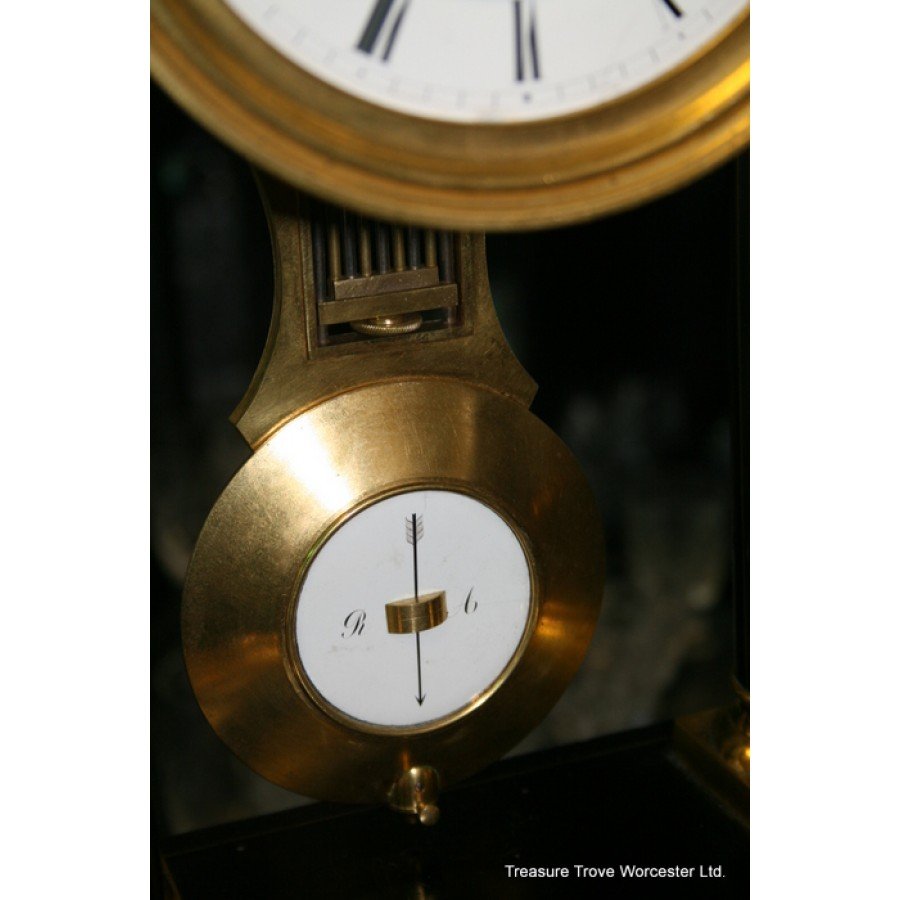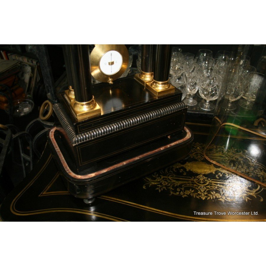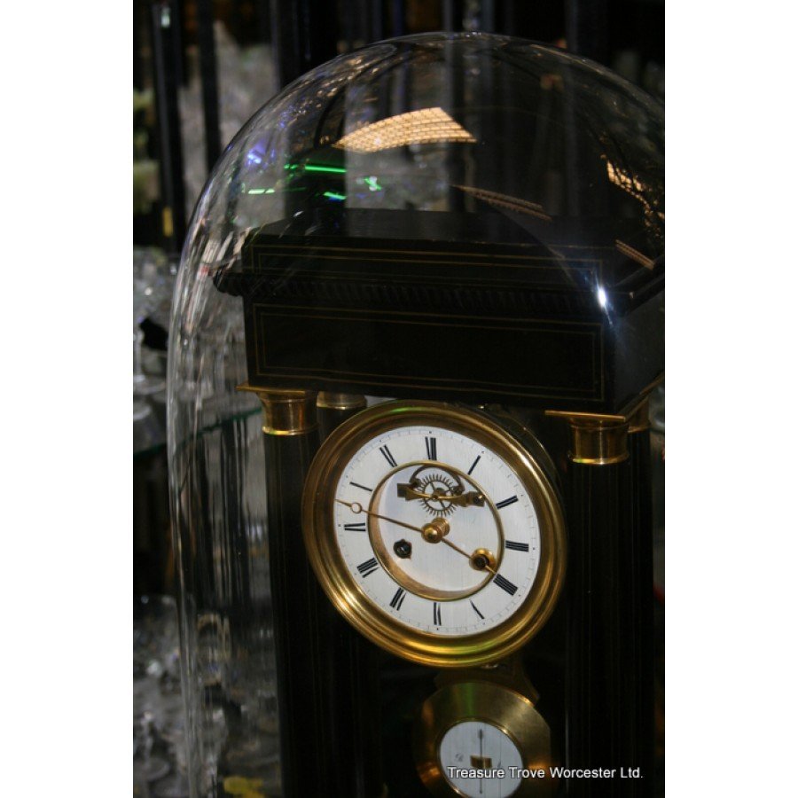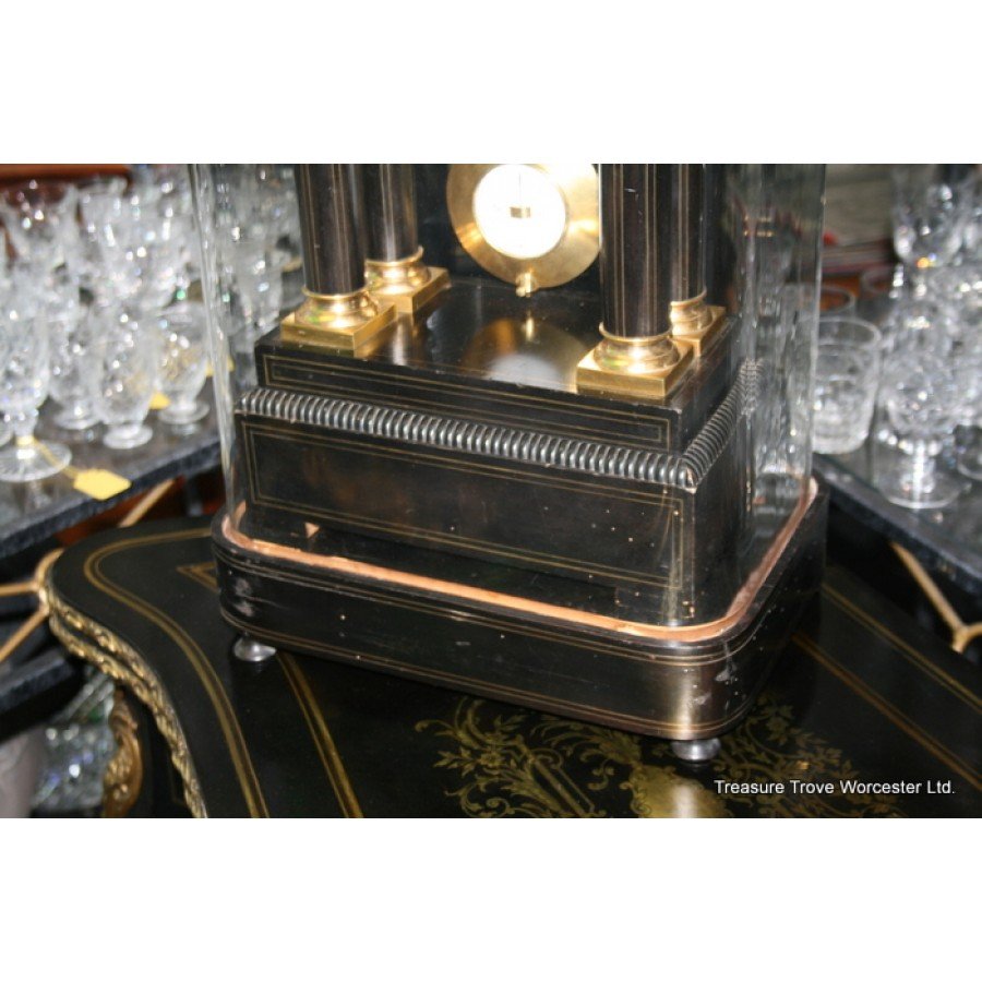 Case The clock is in a classical manner with the movement surmounted by four classical columns with brass capitals and bases. Fine mitred brass inlay to the entablature. Ornately shaped unusual brass pendulum with enamel centre. The clock sits on a footed base with original glass dome.