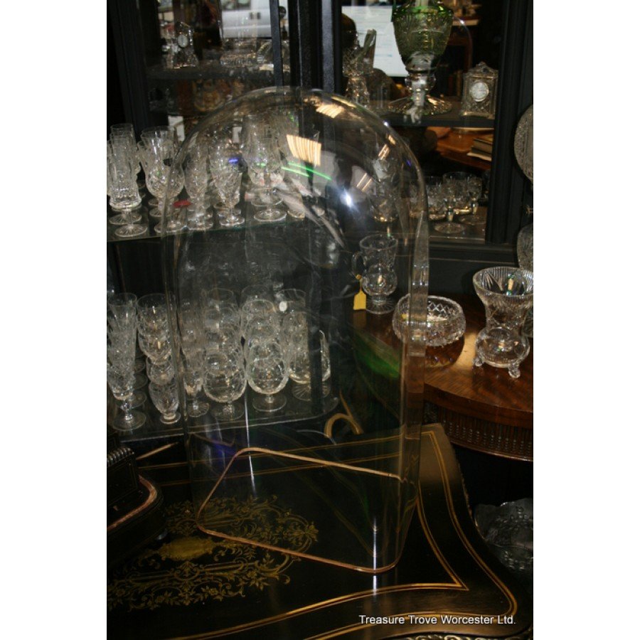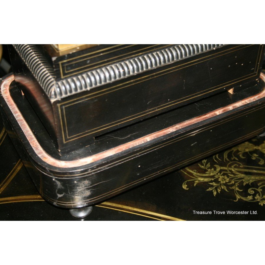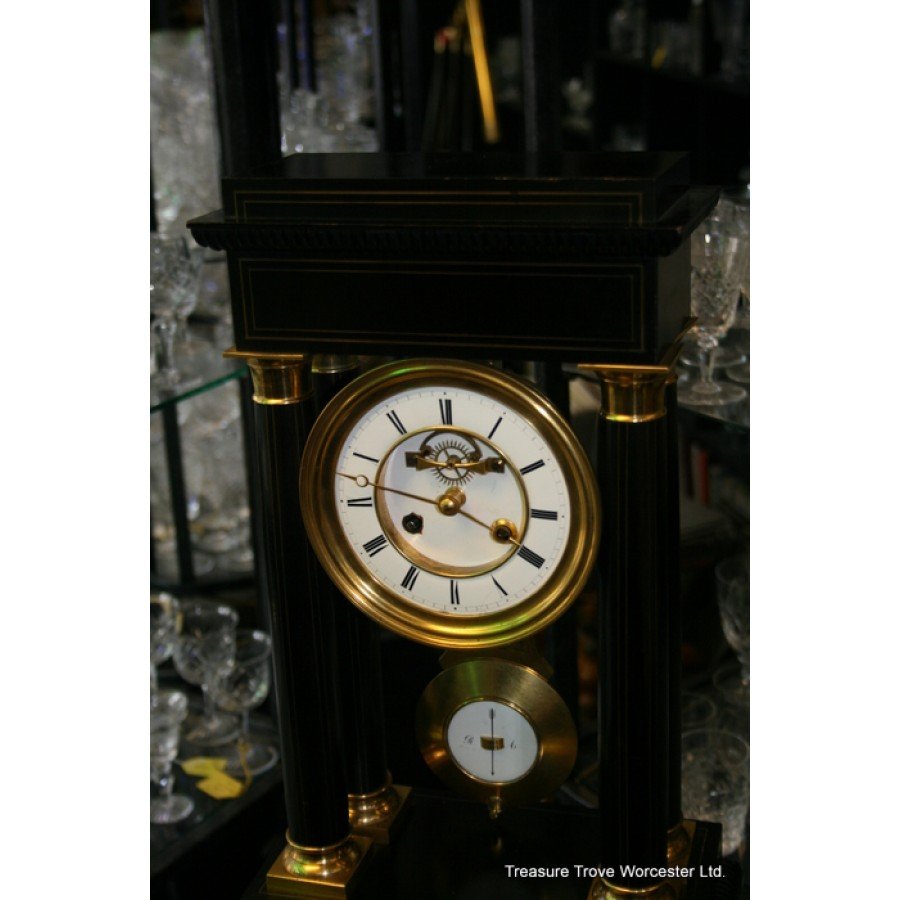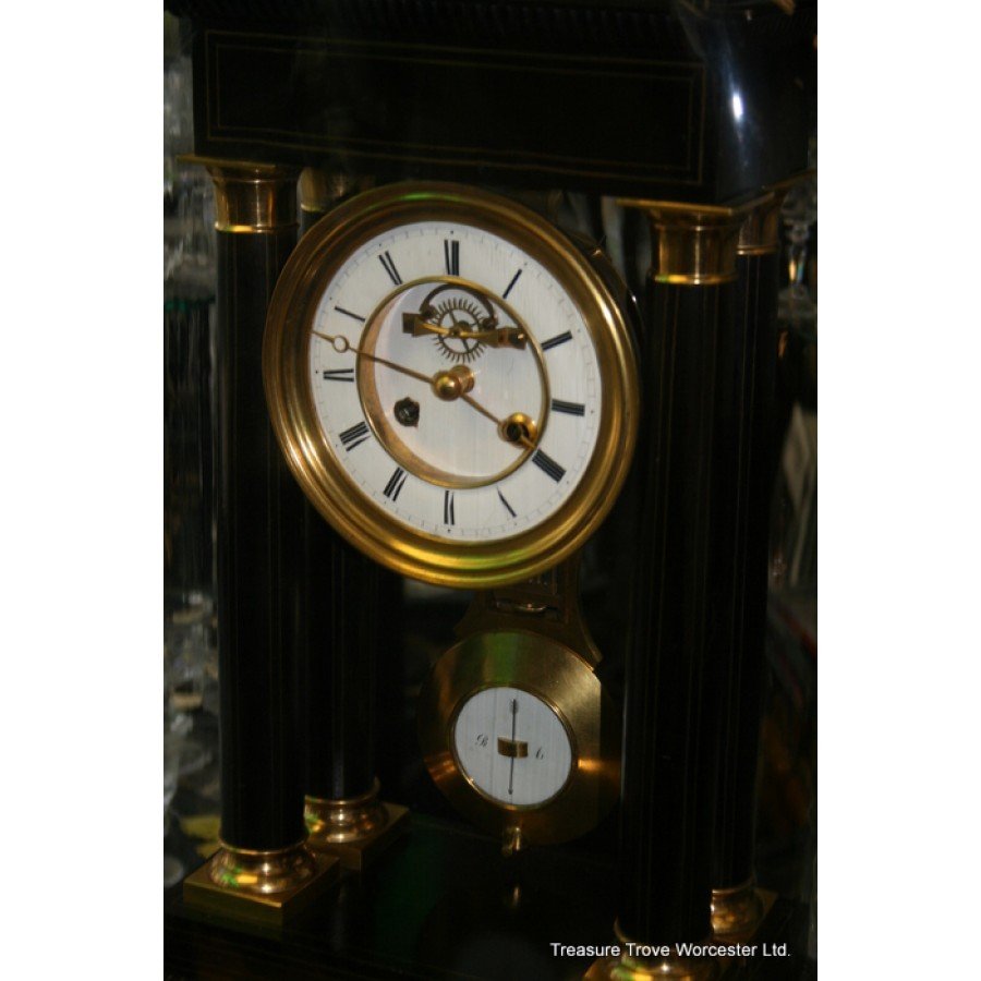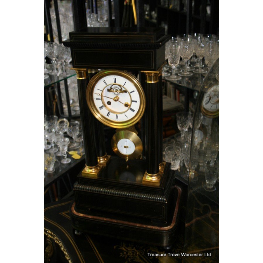 Case The clock is in a classical manner with the movement surmounted by four classical columns with brass capitals and bases. Fine mitred brass inlay to the entablature. Ornately shaped unusual brass pendulum with enamel centre. The clock sits on a footed base with original glass dome.