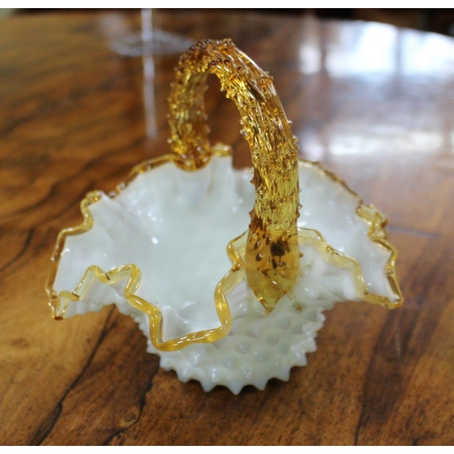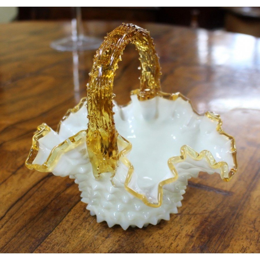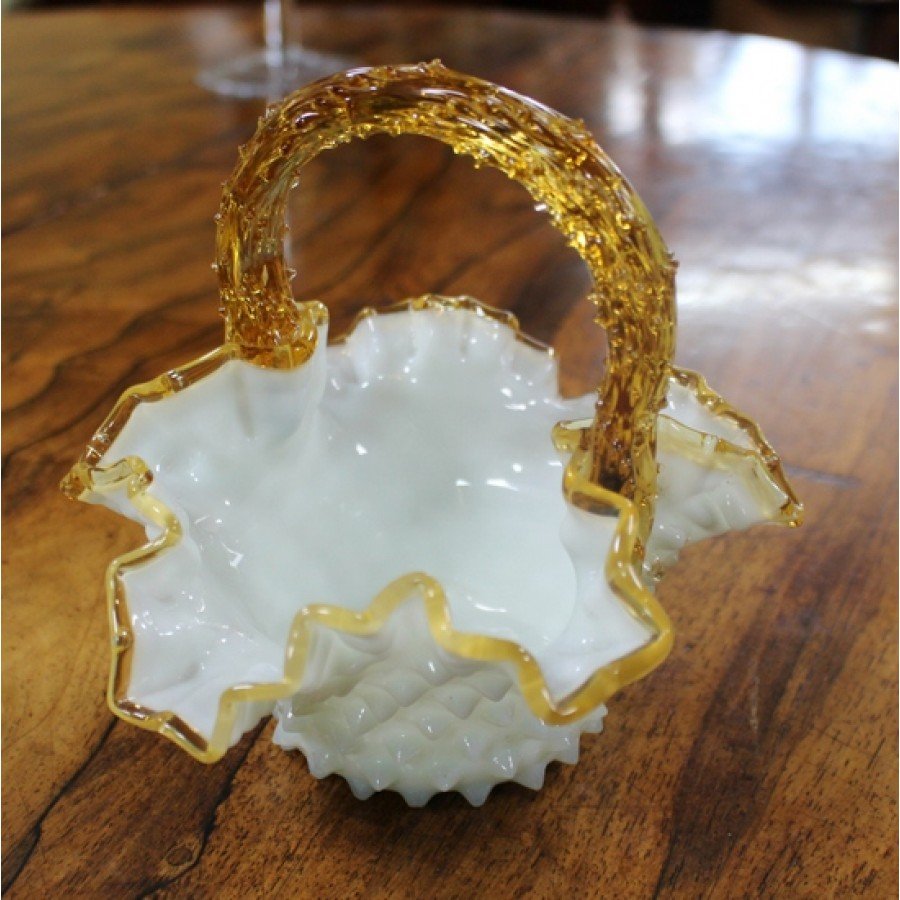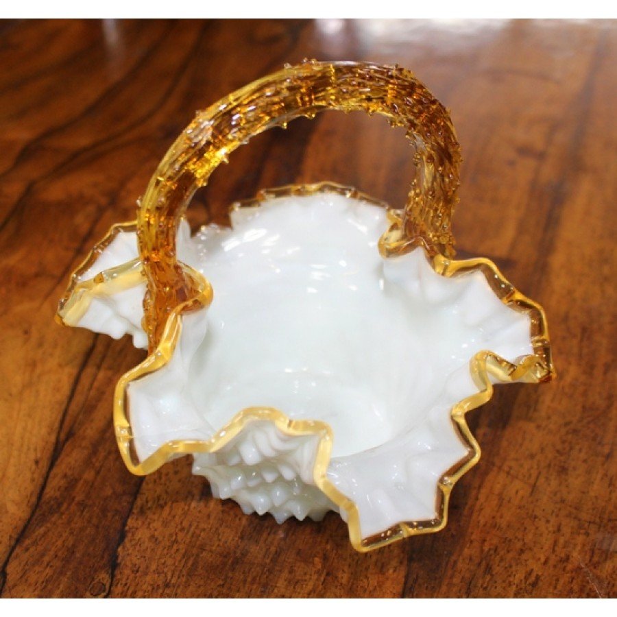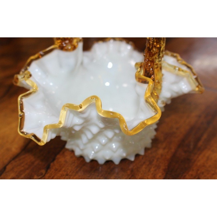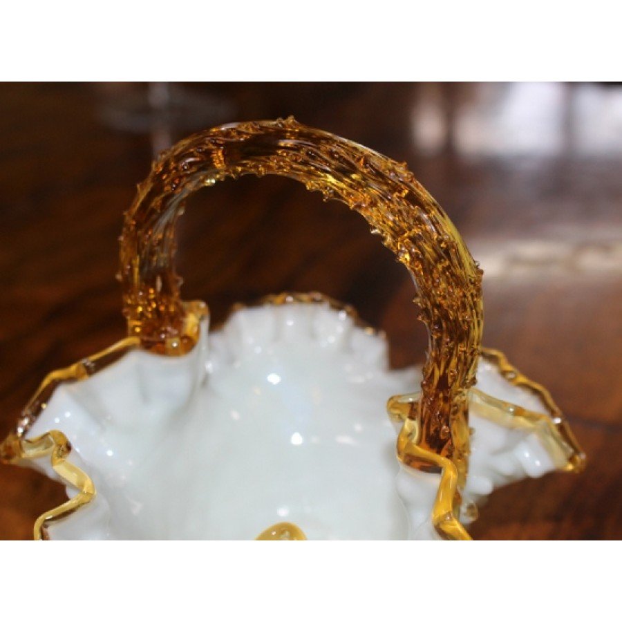 Victorian Amber & Milk Glass Scalloped Handled Basket